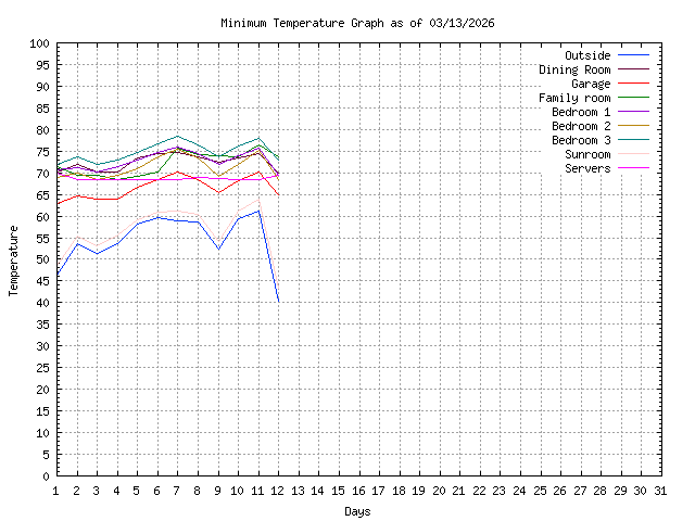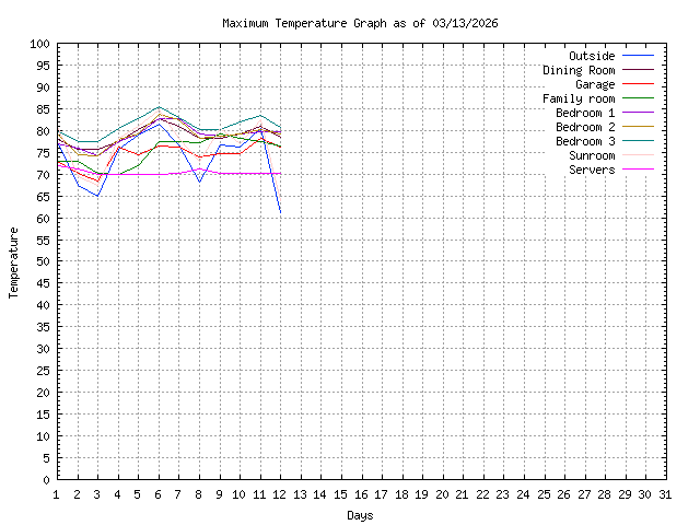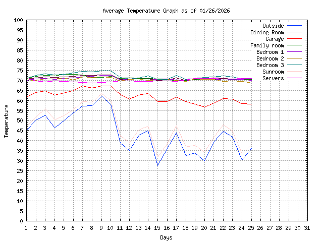 | Day | Outside | Dining Room | Garage | Family room | Bedroom 1 | Bedroom 2 | Bedroom 3 | Sunroom | Servers |