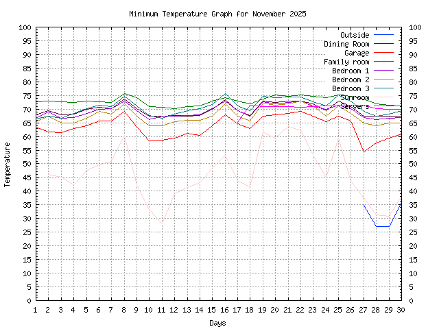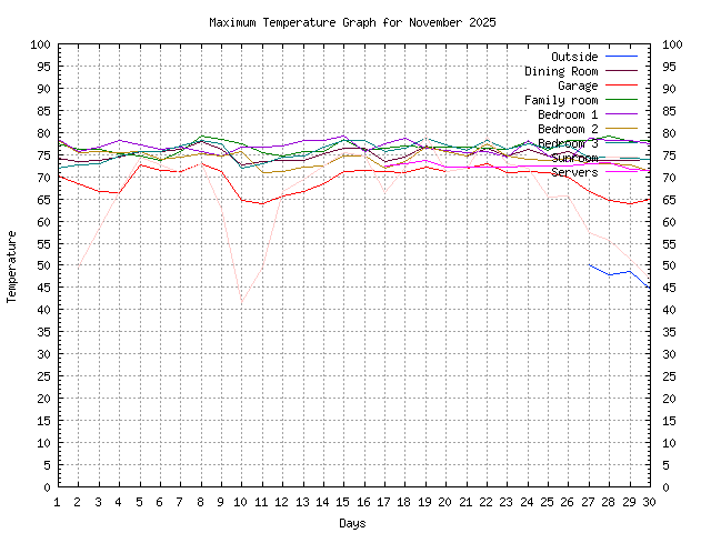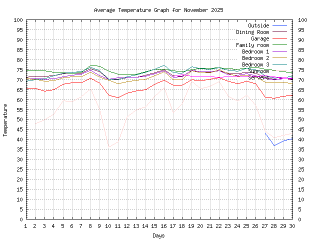 | Day | Outside | Dining Room | Garage | Family room | Bedroom 1 | Bedroom 2 | Bedroom 3 | Sunroom | Servers |